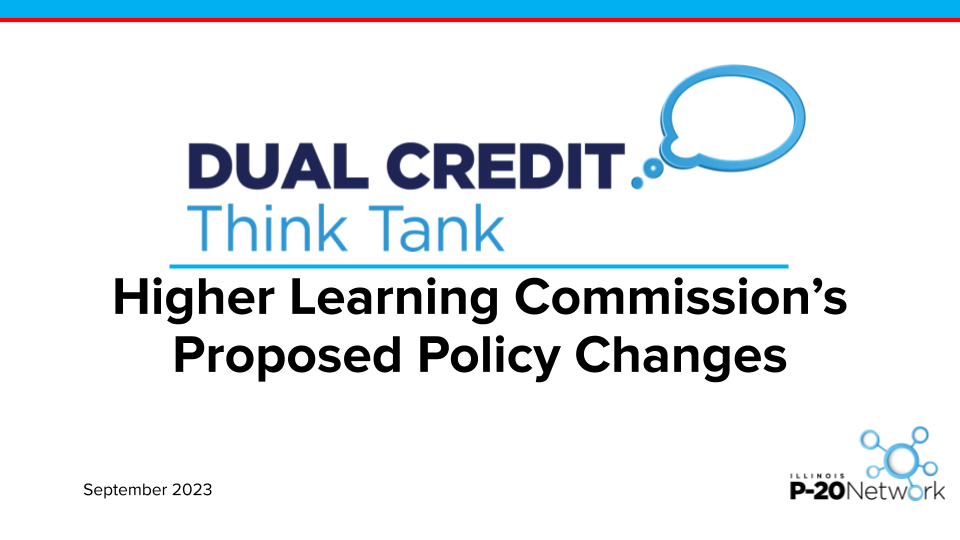 The proposed policy changes and the information shared by the Dual Credit Think Tank present a time-sensitive opportunity for both school districts and postsecondary institutions to engage in a conversation about how these changes may impact their goals and their directions moving forward. For example, the HLC is seeking to adopt Progress toward academic credentials as an alternative to approve instructors to teach college courses. In the context of dual credit, this allows dual credit partnerships to construct a framework to explore the use of Professional Development Plans as a means to be credentialed to teach dual credit courses, similar to what is described in the Dual Credit Quality Act. Additionally, Illinois P-20 Network partners might find value in learning more about implementing a local policy that uses Equivalent Experience to increase dual credit instructors within career and technical education.